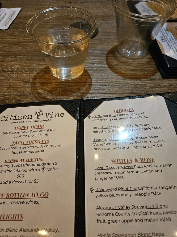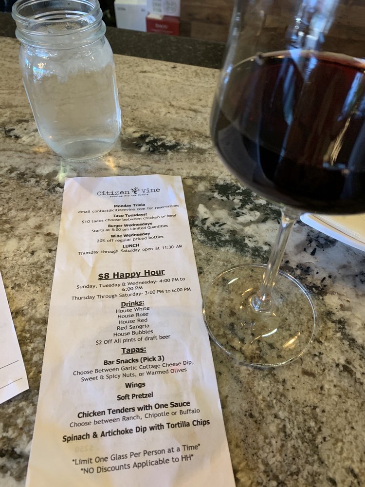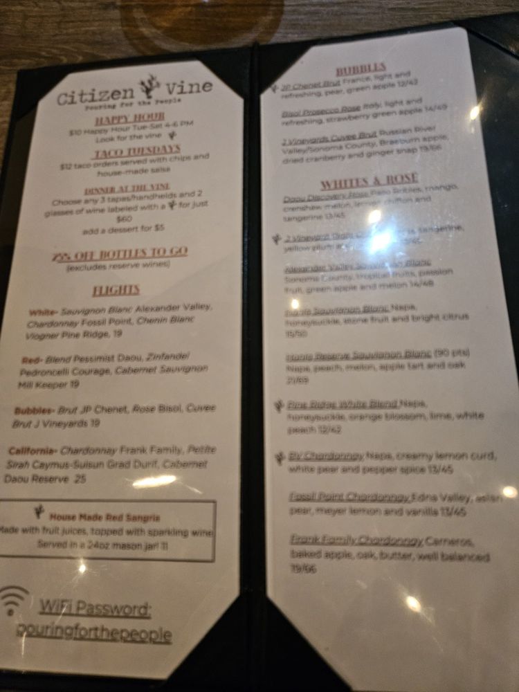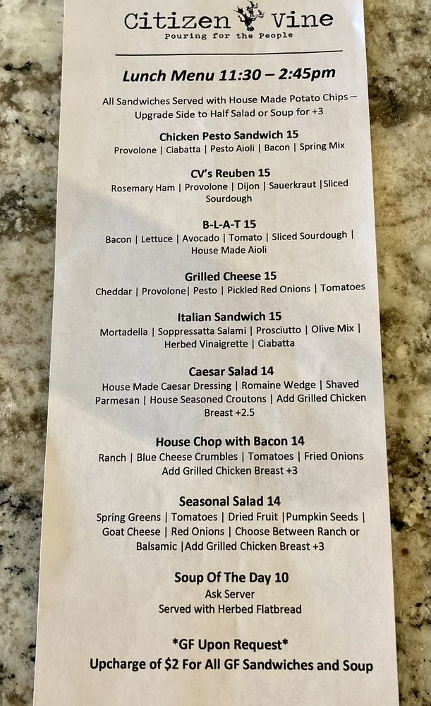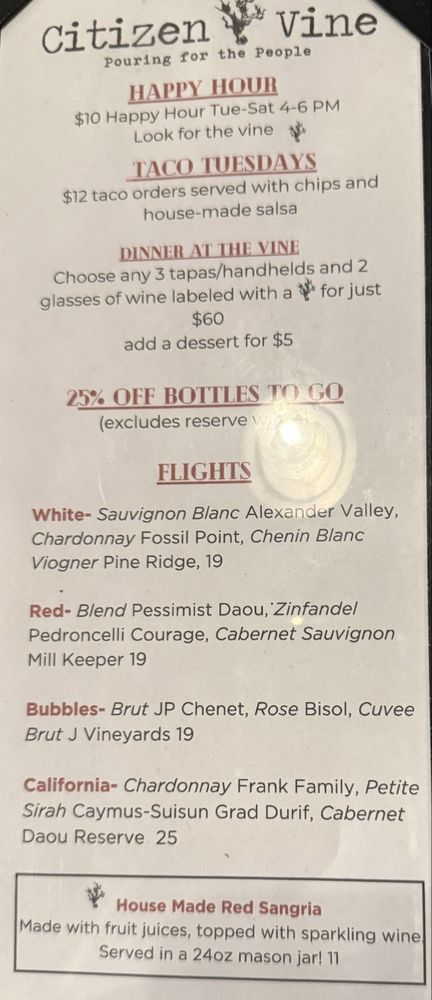 Patrons rave about the friendly service, relaxing ambiance, and the ability to cater to groups with takeout and delivery options. Additionally, features such as outdoor seating and a military discount make Citizen Vine a versatile dining destination.